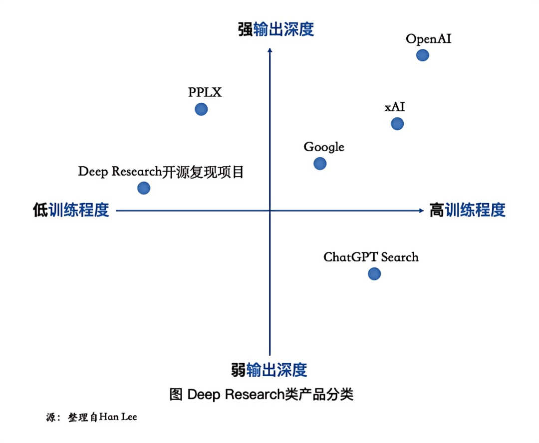 参考 Han Lee 的 2×2 分析框架,目前 Deep Research 类产品在输出深度、训练程度两大维度呈现分异。输出深度即产品在先前研究成果的基础上进行了多少次迭代循环以收集更多信息,可进一步被理解为 Agentic 能力的必要基础。低训练程度指代经过人工干预和调整的系统,比如使用人工调整的 prompt,高训练程度则是指利用机器学习对系统进行训练。