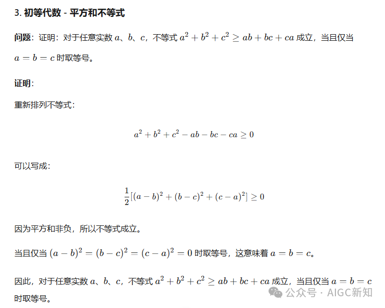 呈现方式:DeepSeek模型的证明更为详细,展开了完整的代数推导过程;而参考答案更为简洁,直接给出了关键变形$frac{1}{2}[(a-b)^2 + (b-c)^2 + (c-a)^2] geq 0$。