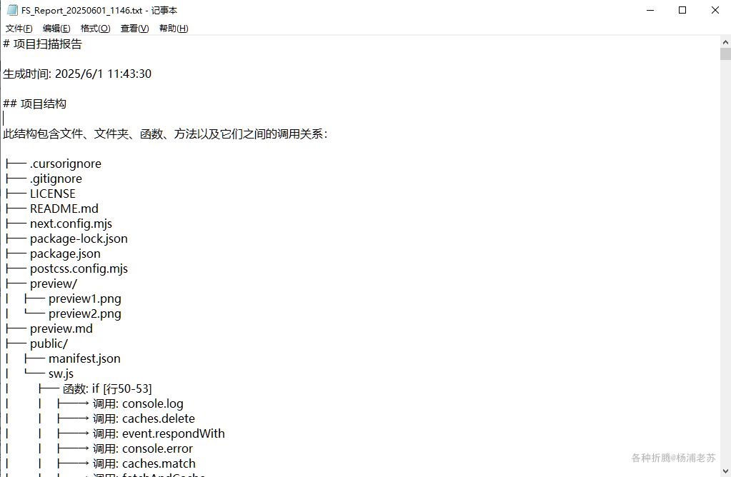 下载的报告是 FS_Report_20250601_1146.txt 这样的文件,包含了项目文件、文件夹、函数、方法以及它们之间的调用关系、可用于 ChatGPT 、Claude 等