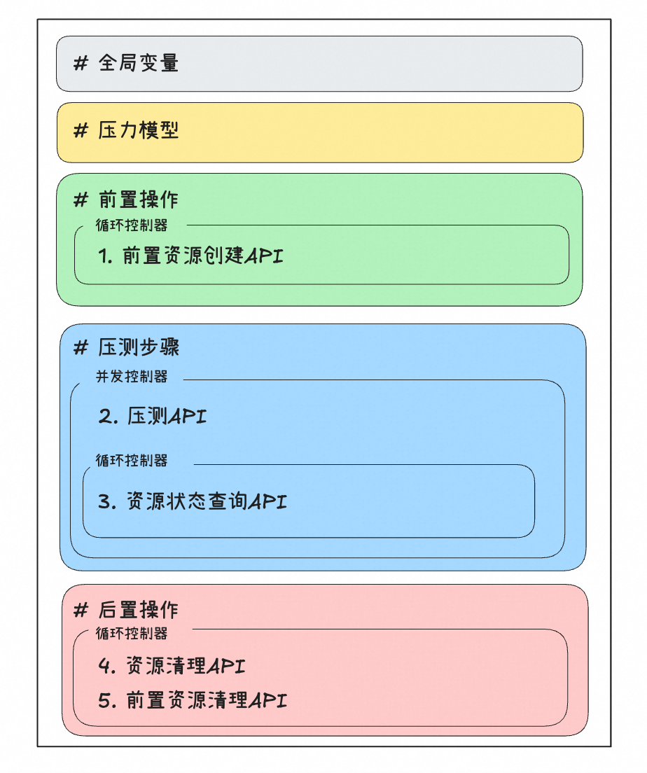 我们对API压测工作流进行了抽象与建模,定义了一套通用的API压测用例模板如下: