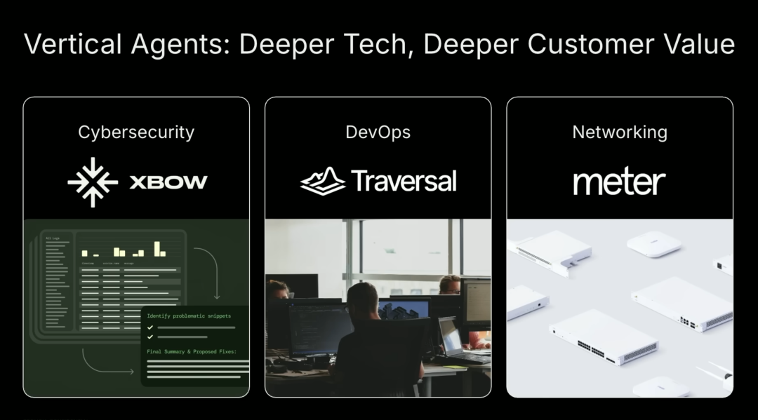 我们对2025年Agent公司的形态也有一个预测:垂直领域智能Agent将成为主流。对那些深耕特定行业的创业者来说,这将是一次绝佳机会。我们已经看到一些企业通过合成数据强化学习、结合真实用户数据训练,构建出聚焦于特定工作流的智能Agent系统。这些迹象让我们感到非常乐观。例如,安全行业的Expo展示了能超越人类渗透测试员的AI;在DevOps领域,Traversal的AI故障排查系统已经优于最顶级工程师;网络运维方面,Meter同样表现优异。