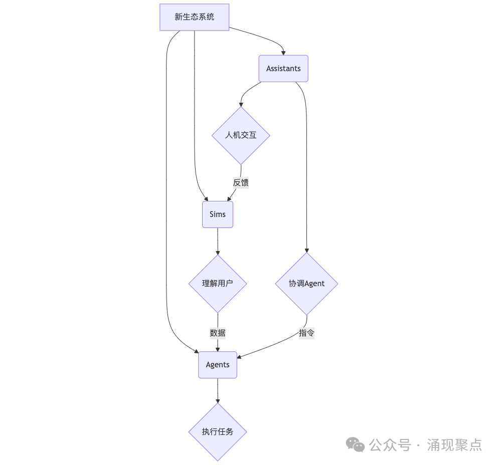 这幅图清晰地展示了新生态系统中 Agents、Sims 和 Assistants 的角色和相互关系。Agents 负责执行具体任务,Sims 负责理解和学习用户,Assistants 则负责协调 Agents 并进行人机交互。Sims 向 Agents 提供数据支持,Assistants 向 Agents 发出指令,同时通过人机交互获得反馈,不断优化 Sims。