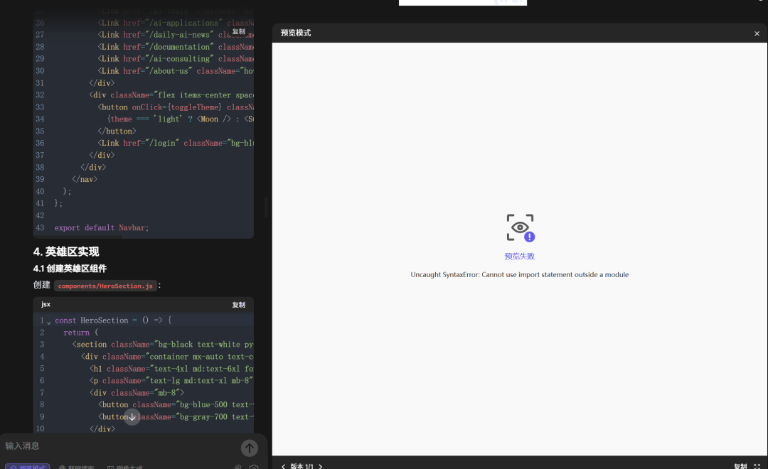 他并没有成功,也就是说在复杂任务代码编写上,显得有些捉襟见肘的,这方面就不如我们以前介绍的一些AI Artifacts工具了。