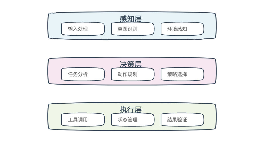 一个完善的 AI Agents 系统应该像一座精心设计的建筑,每个组件都有其明确的职责和合理的布局。在架构层面,我们需要关注三个核心层次: