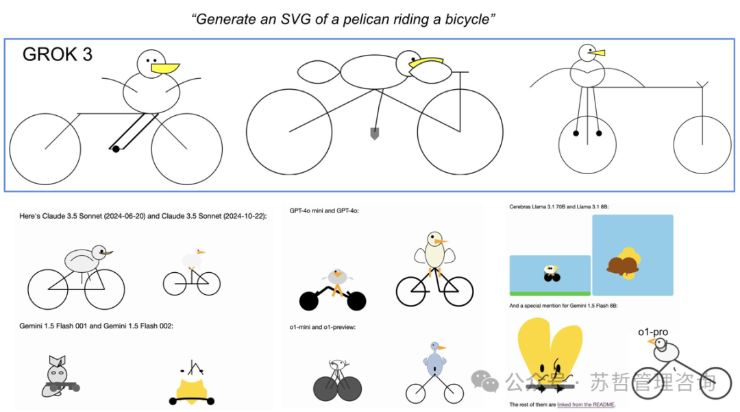 ❌Simon Willison的“*生成骑自行车的鹈鹕的SVG*”。它强调LLM在2D网格上布置许多元素的能力,这非常困难,因为LLM不能像人那样“看到”,所以它在黑暗中以文本的形式排列事物。标记为失败是因为这些鹈鹕很好,但仍然有点破(见图片和比较)。Claude的是最好的,但我认为我怀疑他们在训练期间专门针对SVG功能。