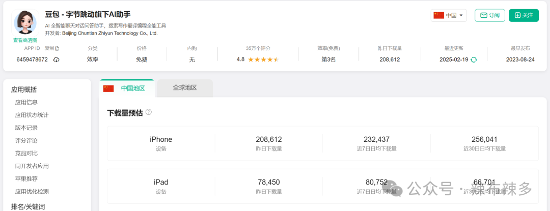 通过在点点数据官方平台选择应用-AI-人工智能相关应用,得到在2025年2月份相关应用的下载榜,选择榜单排名前十的应用进行候选,结合艾瑞咨询关于2024年1-11月移动端AI应用的月独立设备数的相关数据,最后选择行业流量和市占率最大的抖音集团旗下的豆包为竞品做对比分析;