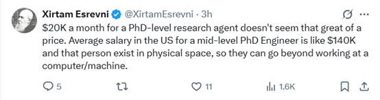 还有人嘲讽道,我们得和这个每月收费 2 万美元的博士级Agent交个朋友。说不定它会同意把一些任务交给我们来做,然后给我们一成报酬呢。