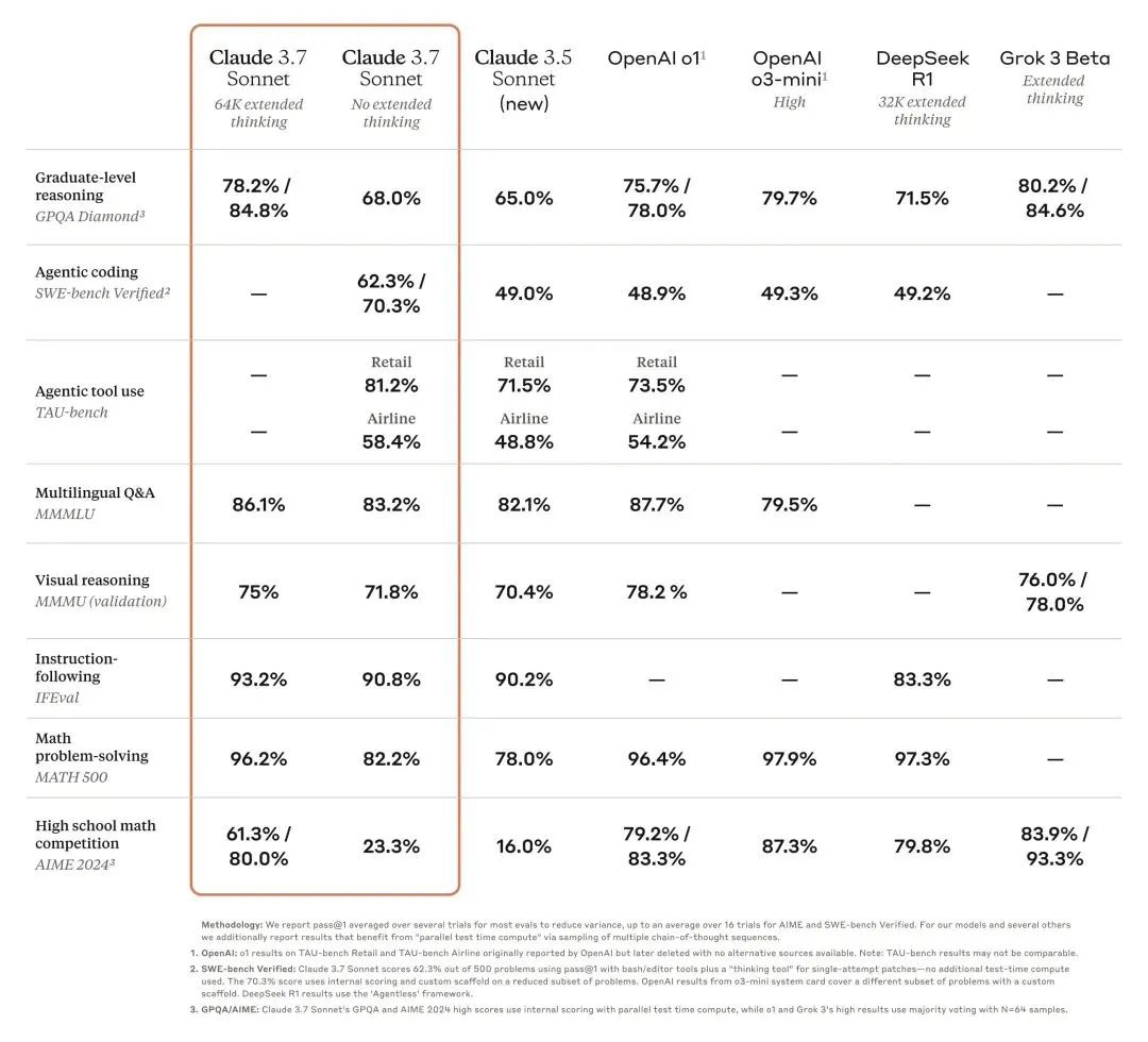 Claude 3.7 Sonnet 在指令遵循、通用推理、多模态能力和智能编码方面表现出色,扩展思考在数学和科学方面实现了显著提升,但在一些方面依然不及 OpenAI 的 o3-mini (high)、Grok-3 Beta 等。